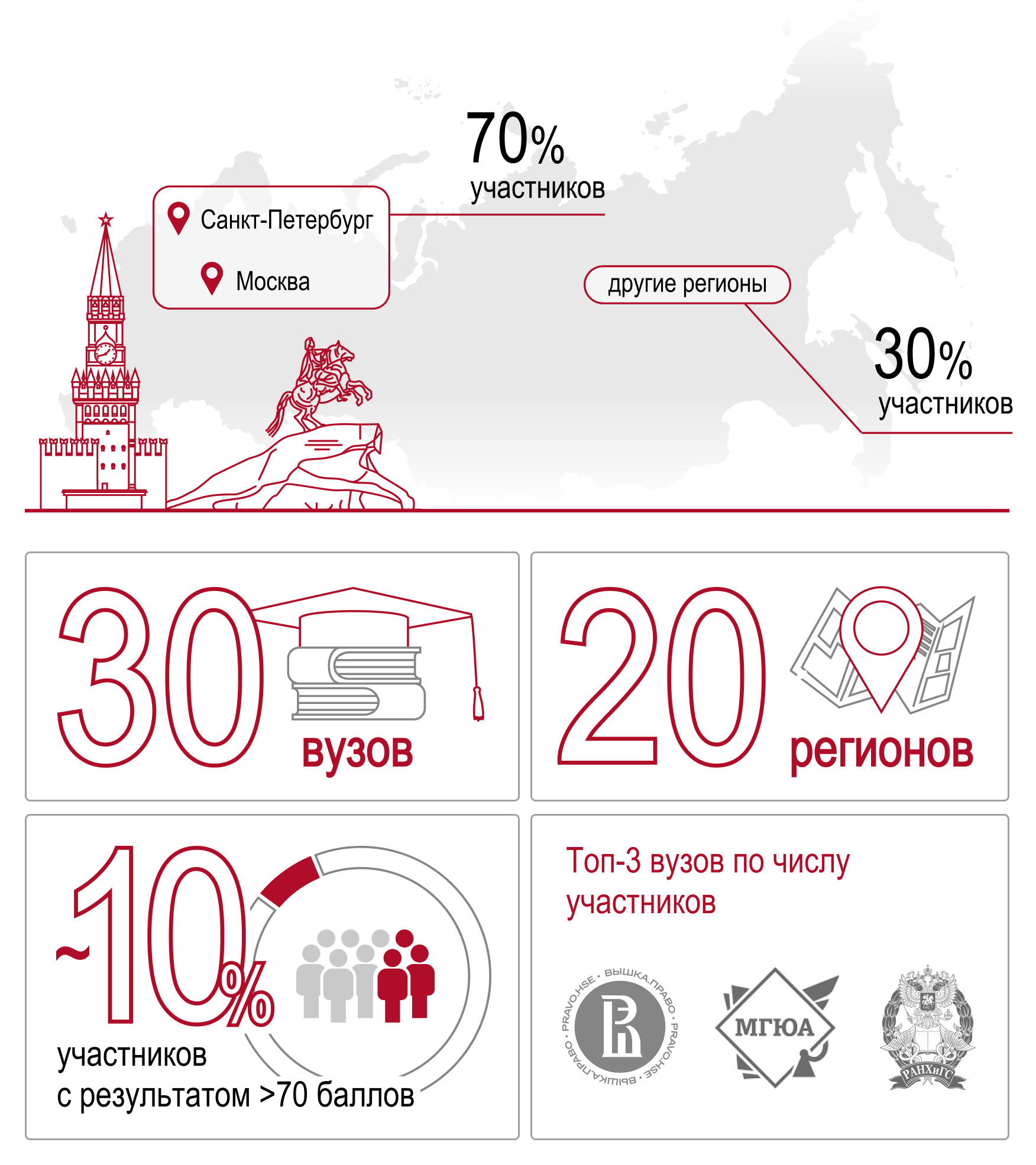 Участие в онлайн-тестировании приняли около 90 студентов юридических факультетов 30 российских вузов из 20 регионов России.